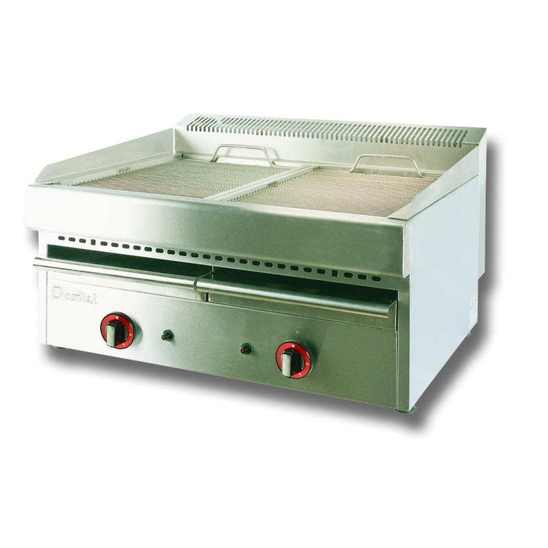 Barbacoa a gas, parrillas con sistema de bandejas contenedoras de agua, eliminando un 80% de humos y llamas NG-33, construida totalmente en acero inoxidable.