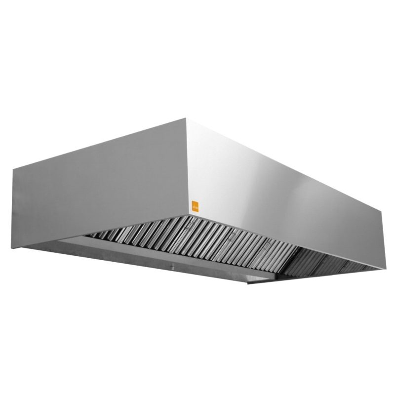 La campana ECO R es ideal para techos de baja altura, con diseño de faldones rectos y capacidad de retener gran capacidad de humo en su interior.