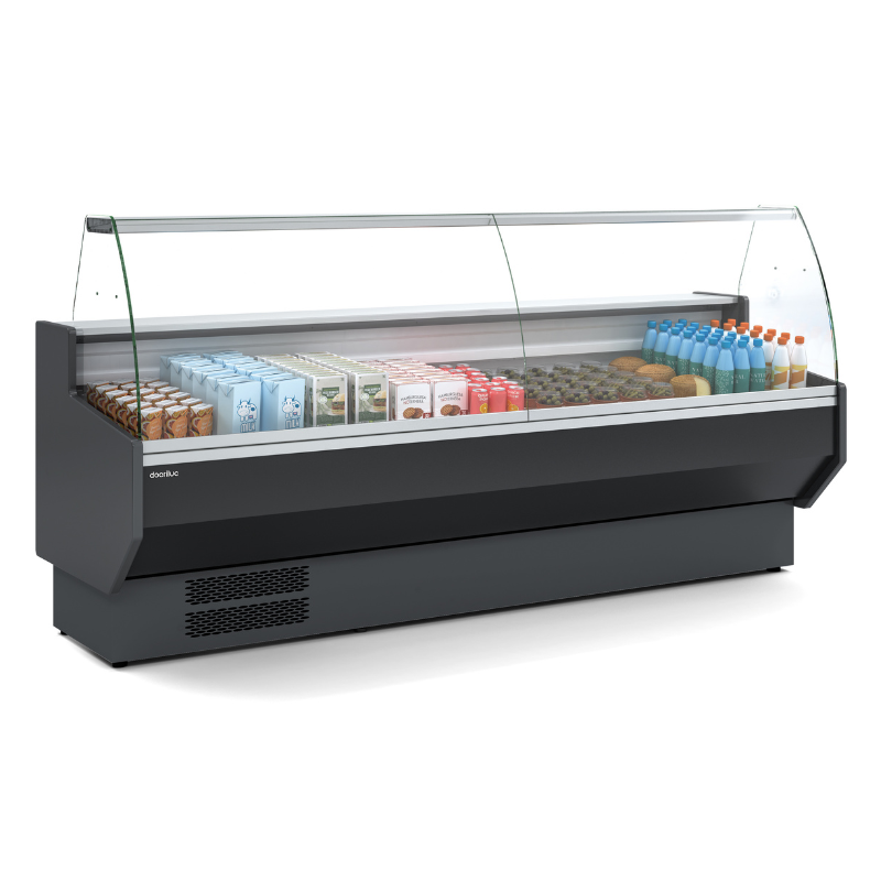 Vitrina expositora refrigerada Vesper VE-8-10-R con reserva y cristal curvo, diseñada para garantizar la conservación óptima y la máxima visibilidad de los productos.
