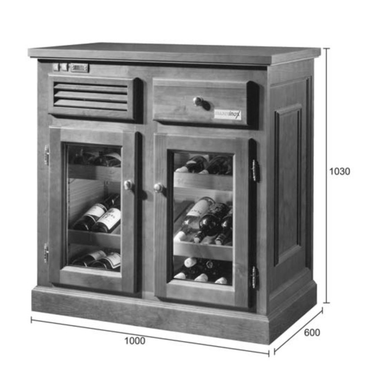 Vinoteca mesa refrigerada MORILES, fabricado en madera maciza especialmente tratada con acabado inteior en madera de melamina.