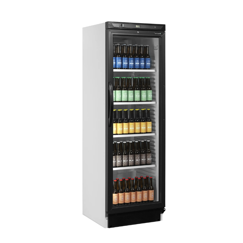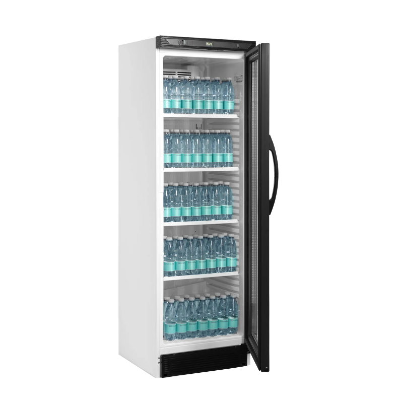 Armario expositor bebidas CEV425 1 LED cuenta con todo lo necesario para presentar bebidas muy frías de la mejor manera posible. Equipado con iluminación LED en el marco de la puerta y estantes ajustables.