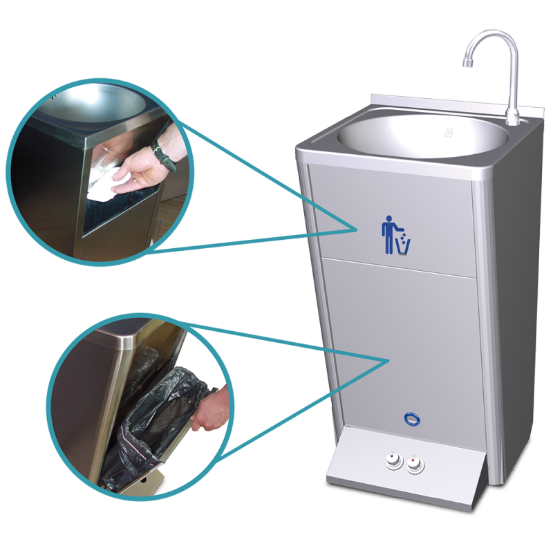 Lavamanos portátil autónomo doble pulsador agua fría y caliente, totalmente construido en acero inoxidable.