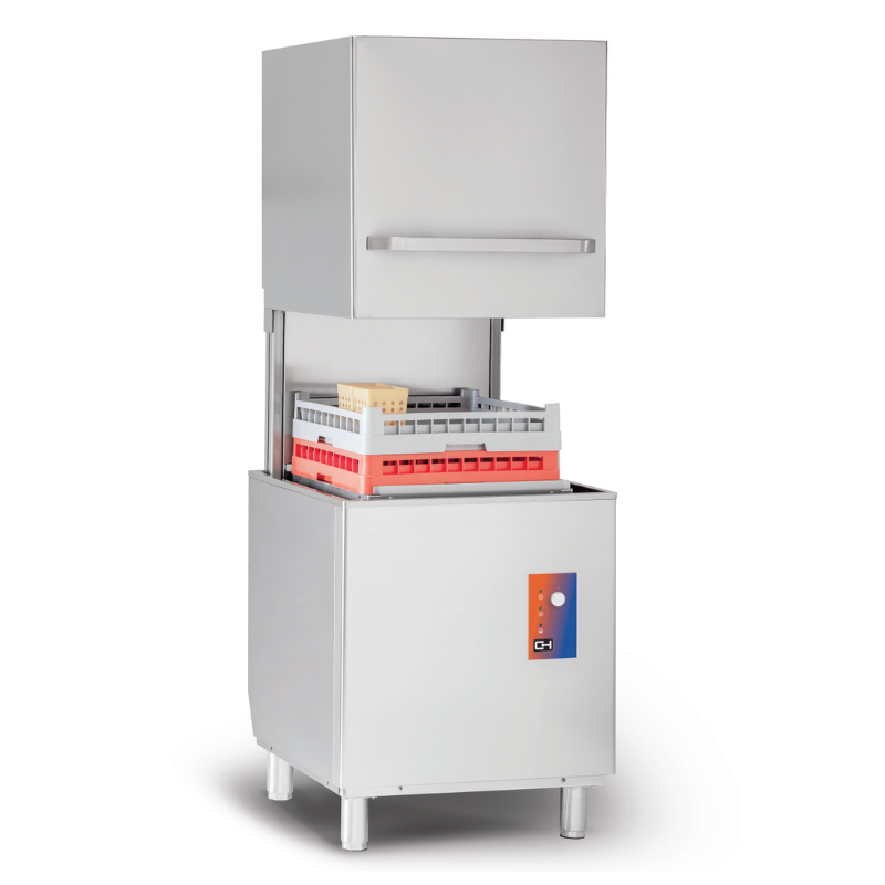 Lavavajillas de capota industrial cesta 50x50, fabricado en acero inoxidable tanto en interior como en exterior.