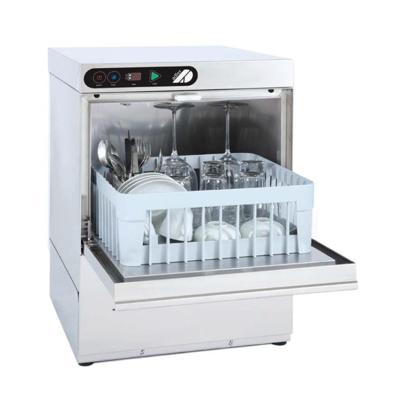Lavavajillas industrial cesta 50x50, fabricado en acero inoxidable tanto en interior como en exterior.