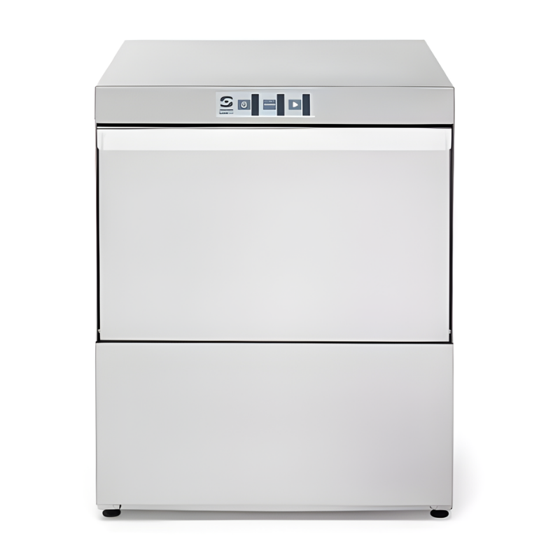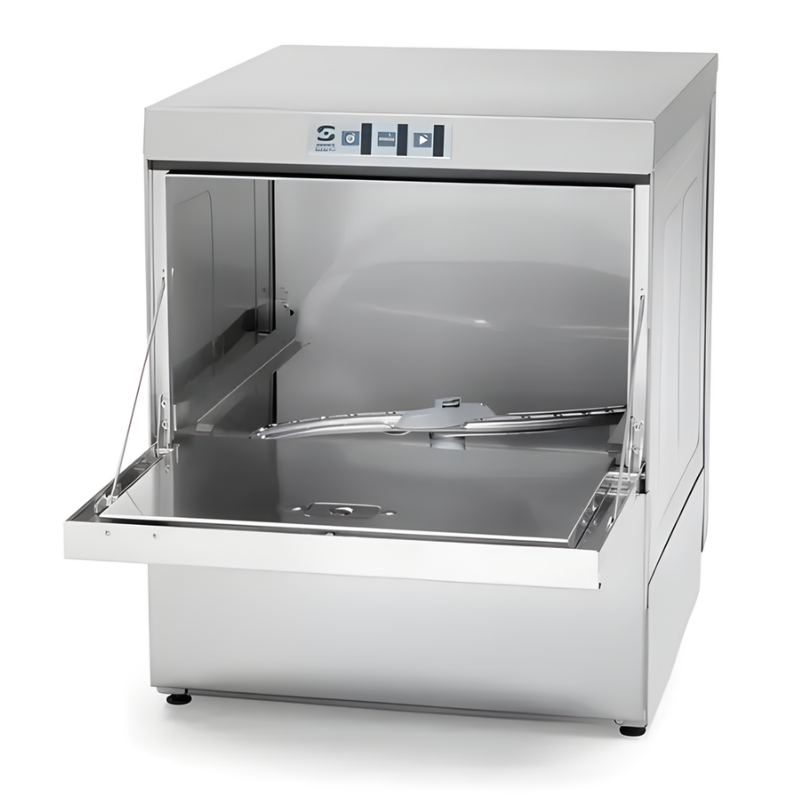 Lavavajillas industrial cesta 50x50, fabricado en acero inoxidable tanto en interior como en exterior.