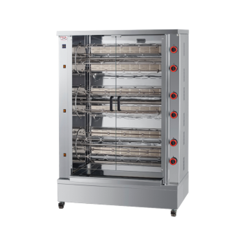 Asador multirotativo para pollos 12MR, consumo económico. Asado perfecto y uniforme dorado del pollo al máximo.