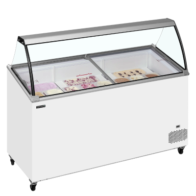 Vitrina de heladería Isabella con tapas curvada 13LX perfecto para mostrar helados con la mejor iluminación