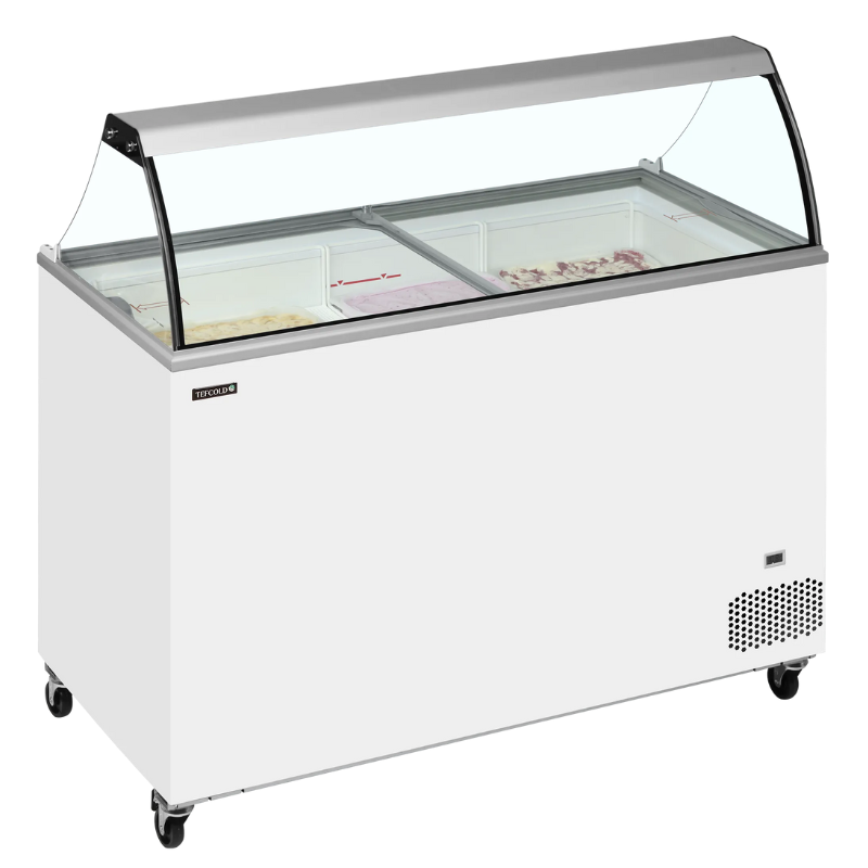 Vitrina de heladería Isabella con tapas curvada 13LX perfecto para mostrar helados con la mejor iluminación