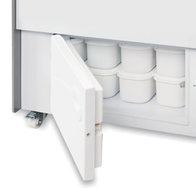 Vitrina expositora para helados, VCB 15 UH, construida con una encimera de trabajo en compac quartz blanca.