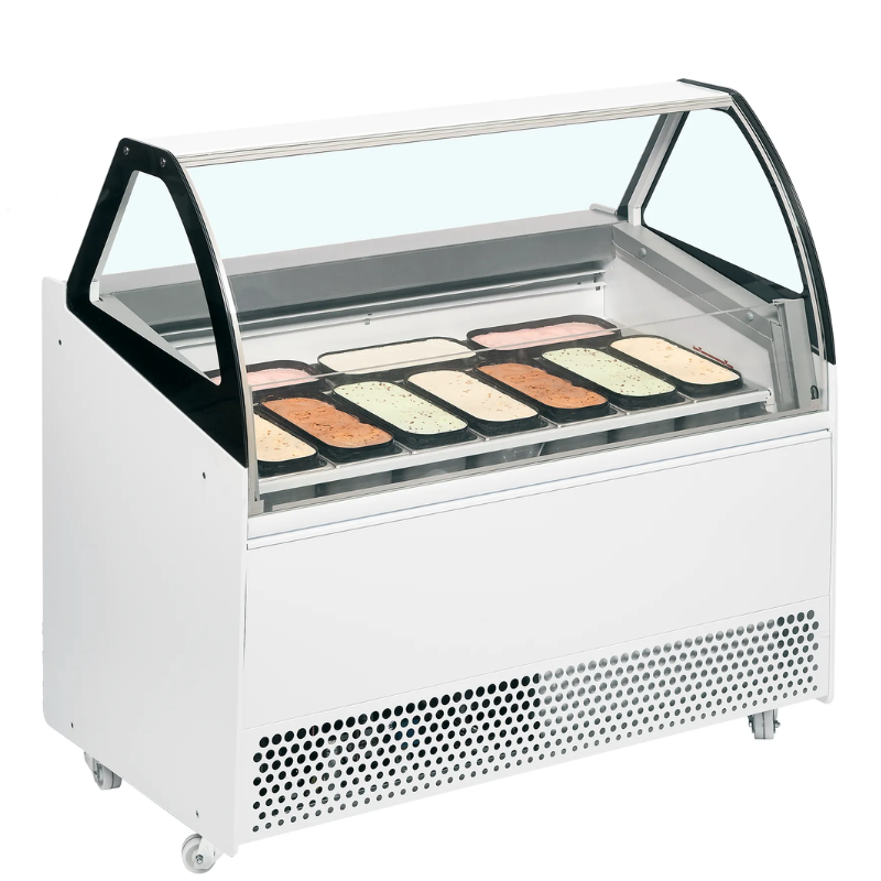 Vitrina para heladería con frontal de cristal curvado BERMUDA RV10 perfecto para exponer diferentes helados