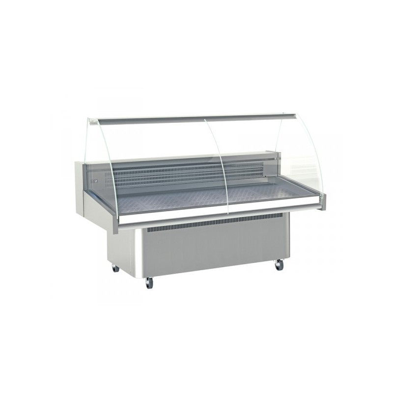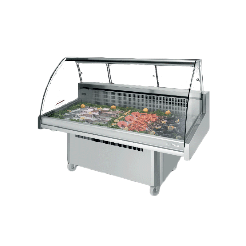 Vitrina expositora refrigerada especial para pescado con cristal curvo securizado.