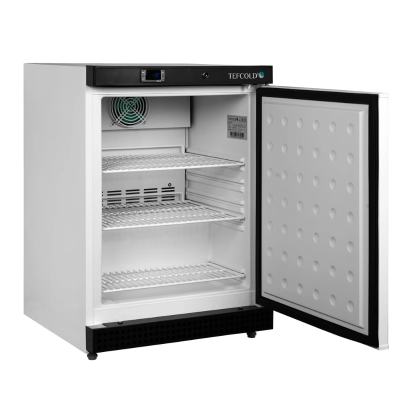 Armario refrigerado sobremostrador T-50, fabricado en chapa de acero lacado negro con textura antiarañazos en exterior y ABS blanco en interior.