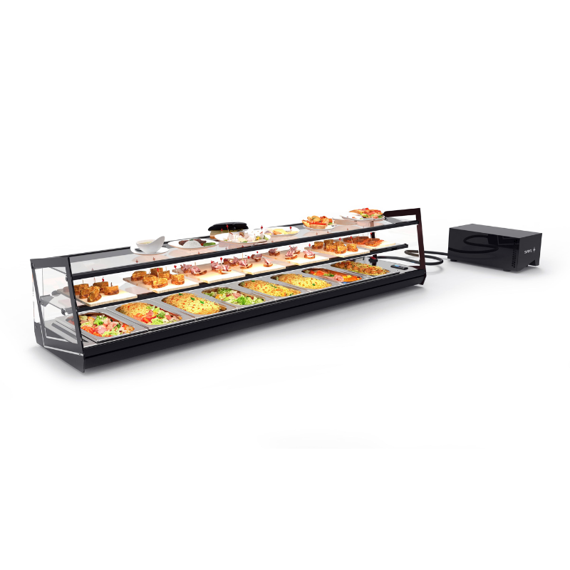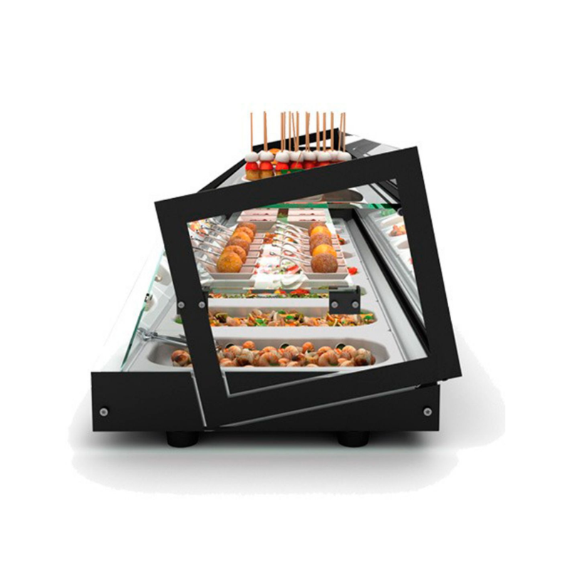 La vitrina de tapas práctica y diferente que hace las delicias de los diseñadores de locales contemporáneos, por la rectitud de sus líneas y su diseño moderno y sofisticado. Dispone de tres pisos de exposición en el mismo espacio que una vitrina convencional. Sencillamente espectacular.