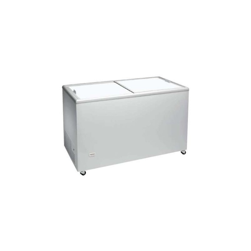 Congelador horizontal puerta corredera ciega ICE400NTOS, fabricado tapa, cuba exterior e interior en chapa de acero plastificada blanca atóxica y con tratamiento anticorrosión. Marco de puertas en ABS gris inyectado.