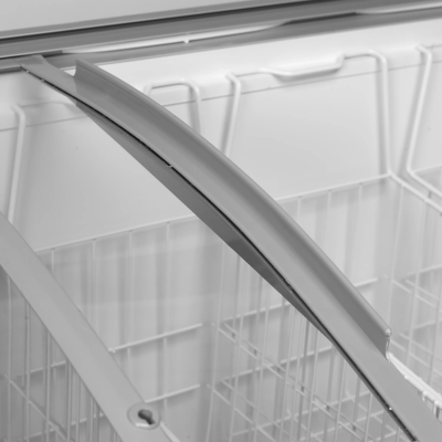 Congelador horizontal puerta corredera cristal ICE400NTVS, fabricado tapa, cuba exterior e interior en chapa de acero plastificada blanca atóxica y con tratamiento anticorrosión. Marco de puertas en ABS gris inyectado.
