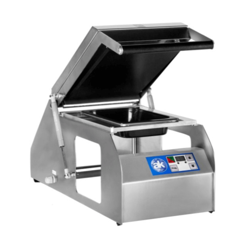 Termoselladora para cubetas S/V 400, para el sellado de barquetas con film, construida en acero inoxidable y aluminio anticordal.